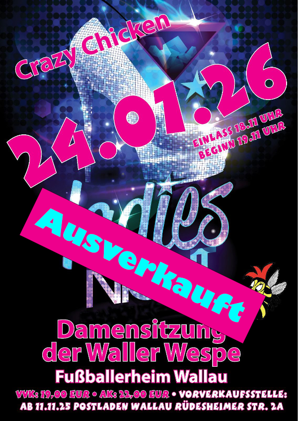 Für die Crazy Chicken, eine der vereinseigenen Showtanzgruppen, der perfekte Zeitpunkt, den Kartenvorverkauf für ihre weithin beliebte Ladies Night zu starten. Als erstes großes Highlight ist die Damensitzung seit Jahren fester Bestandteil der Wespe Kampagne. Bereits zum siebten Mal organisieren und veranstalten die Crazy Chicken dieses pinkschillernde Event. Frau darf gespannt sein, was sich das Dreigestirn diesmal hat einfallen lassen, um das Fußballerheim zum Toben zu bringen. Ob namhafte Show Acts der Karnevalsszene, diverse Männertanzgruppen, mit spitzer Zunge und Augenzwinkern vorgetragene Büttenreden oder Gesangsdarbietungen, das prall gefüllte Programm sollte bei den Damen kaum Wünsche offenlassen.